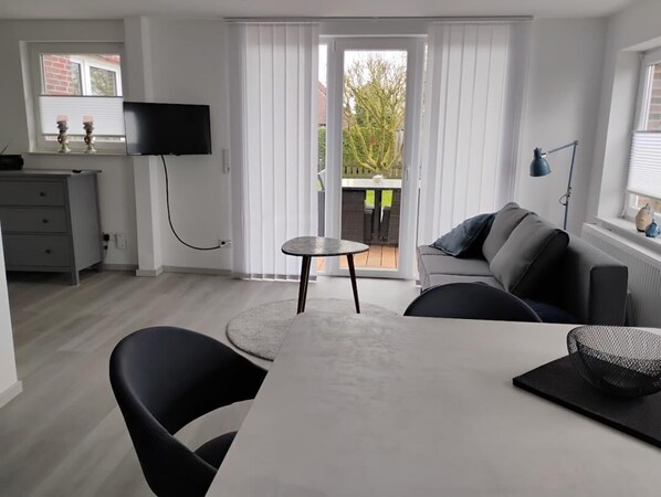 Direkt am Ortsrand von Neßmersiel liegt die Wohnung Wiesenruh in einer ruhigen Sackgasse und ist trotzdem direkt am Ort. Diese moderne Unterkunft ist perfekt für bis zu 2 Personen ausgestattet. Auf dem Schlafsofa im Wohnzimmer können aber noch 2 weitere Gäste übernachten. Ein Kleinkind bis 3 Jahre darf gerne kostenfrei im Elternbett schlafen. Zur Ausstattung der Ferienwohnung Wiesenruh: Schlafzimmer mit Doppelbett und Kleiderschrank, schickes Wohn- und Esszimmer mit moderner Küches sowie schönem Badezimmer mit ebenerdiger Dusche. Auf unserer Terrasse mit kleinem Strandkorb können Sie gemütlich frühstücken oder den Urlaubsabend mit einem Glas Wein oder Bier ausklingen lassen. Rauchen ist in der Wohnung nicht gestattet. Nutzen Sie hierfür gerne den Außenbereich auf der Terrasse. Ein Parkplatz sowie Unterstellmöglichkeiten für Fahrräder und E-Bikes stehen zur Verfügung. Die Bettwäsche und Handtücher können gerne dazugebucht werden. Kleine Haustiere sind bei vorheriger Anmeldung gegen Gebühr erlaubt. Der Kurbeitrag ist vor Ort bei Anreise in bar zu entrichten. Wir freuen uns auf Ihre Urlaubsreservierung. Urlaub an der Nordseeküste! Ruhig gelegen und dennoch sehr zentral. In wenigen Gehminuten erreichen Sie Einkaufsmöglichkeiten, Bäcker,Fahrradverleih, hervorragende Restaurants, sowie die Tourist-Information. Der Hafen mit Fährverbindung zur Insel Baltrum sind sehr schnell zu erreichen. In wenigen Autominuten erreichen Sie Dornum oder Norden-Norddeich.