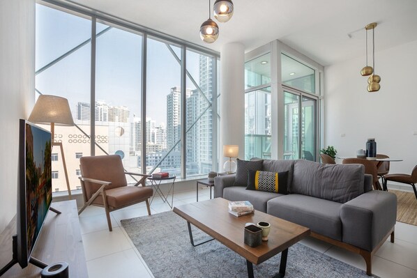 Thoughtfully designed with bespoke finishes, modern furnishings, and a fully equipped kitchen, you’ll enjoy that “I’m home” feeling with this Blueground apartment. Whether you’re lounging in your lovely living room streaming the latest and greatest entertainment on the smart TV or premium wireless speaker, or getting some well-earned rest on the superior quality mattress with fully stocked linens, you’ll fall in love with everything this Dubai Marina apartment has to offer. This apartment also offers in-apartment laundry.