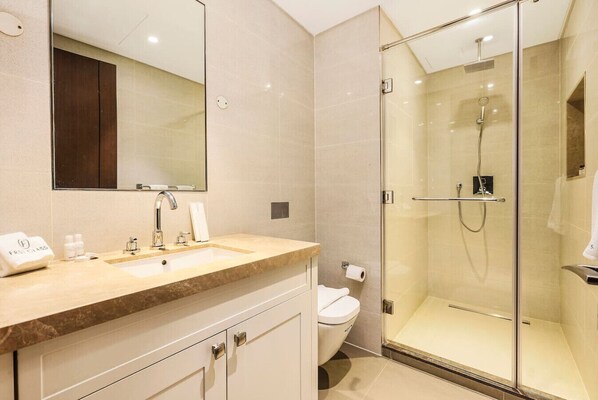 The bathroom is stocked with fresh towels and essential toiletries, so you don`t have to worry about bringing your own.