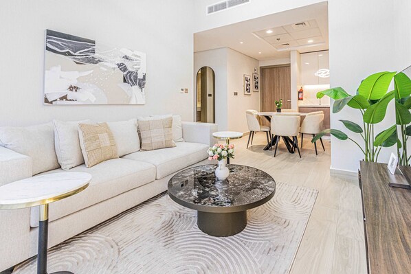 The living area offers ample space for relaxation and entertainment, complete with a plush sofa, a flat-screen TV, and a stylish coffee table. It flows seamlessly into the dining area, where you can enjoy meals in a chic yet cozy setting. Whether hosting friends or unwinding after a busy day, the living space is designed to meet all your needs with a perfect balance of luxury and functionality.