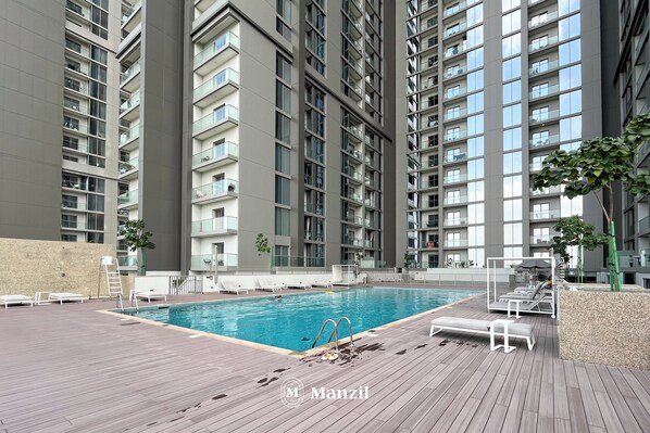 Apartment in Dubai mit folgendem Angebot: eine rund um die Uhr besetzte Rezeption und Außenpool