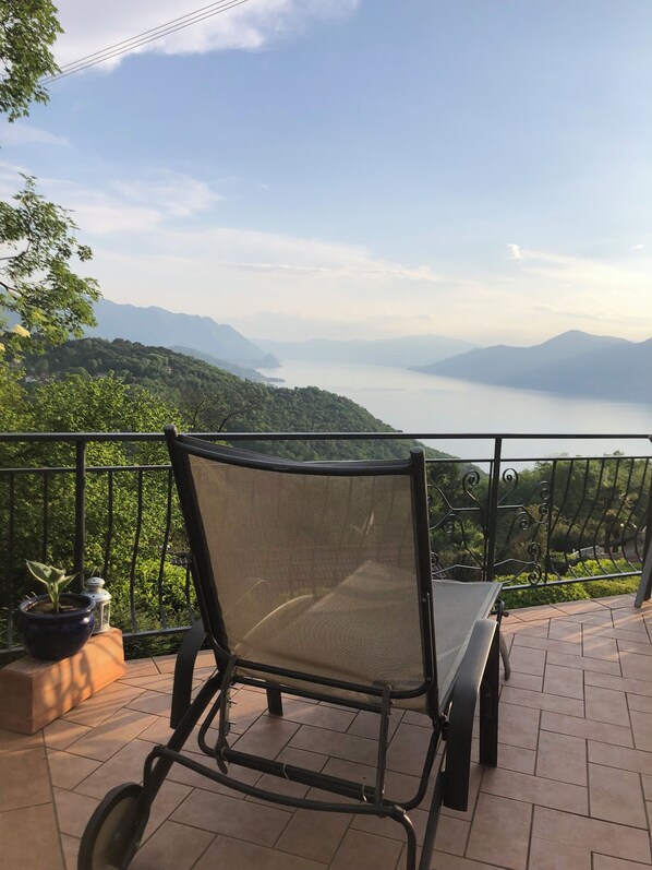 Das Ferienhaus liegt etwa 200 Meter über dem Lago Maggiore in unmittelbarer Nähe von Luino mit seinen vielen attraktiven Freizeit- und Touristikangeboten sowie dem wöchentlichen größten Markt in der Lombardei. Die besondere Lage bietet einen herrlichen Blick auf den See. Das Haus hat einen kleinen mediterranen Garten. Das Herz der Wohnung ist der sehr helle Wohn- und Essraum (ca. 32 qm²) mit eingebauter moderner Küchenzeile, stilvollem Ess,- und gemütlichem Wohnbereich. Von dort geht es direkt auf die über 20 qm² große Terrasse mit einem Panorama-Seeblick auf den Lago Maggiore. Ein Tisch und vier Stühle sowie zwei Liegen laden zum Sonnenbaden und romantischen Abendessen mit traumhaften Seeblick ein. Sie können auf Ihrer Terrasse ganz ungestört das Panorama und die Sonne genießen. Eine Markise und ein großer Sonnenschirm spenden Schatten im Hochsommer wenn Sie von Sonnenaufgang bis weit in den Abend die Sonne und die herrlichen Sonnenuntergänge genießen.