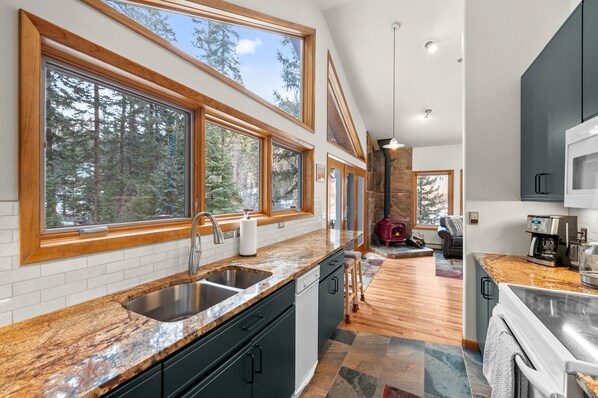 With the main rooms like the kitchen, living room, and main bedroom all on the home's second level, it feels as if you are in the trees. Relaxing by the wood-burning fireplace is a dream, and enjoying meals on the deck when the weather is warmer is a stunning experience.