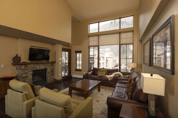 2,000+ square feet, four bedroom residence. Two of the bedrooms have 1 King in each (one with a gas fireplace and TV on ground level), and both have suite bathrooms. Third bedroom has 1 Queen bed and the fourth bedroom has 2 twin beds. These rooms share a bathroom with a shower. The loft area includes a Queen-sized sleeper sofa with another TV. There is a spacious living room with vaulted ceilings, a gas stone fireplace and a Hi-Def LCD television. Full kitchen with stainless steel appliances and granite countertops, 3.5 bathrooms, washer & dryer, High-Speed internet and your own private balcony with furniture. Also included with these units is a personal storage locker on 1st floor level of lodge (for skis/snowboards). Private assigned underground parking for two cars.This Unit is Not Pet Friendly. Non-Smoking. *This Unit is Not Air Conditioned*