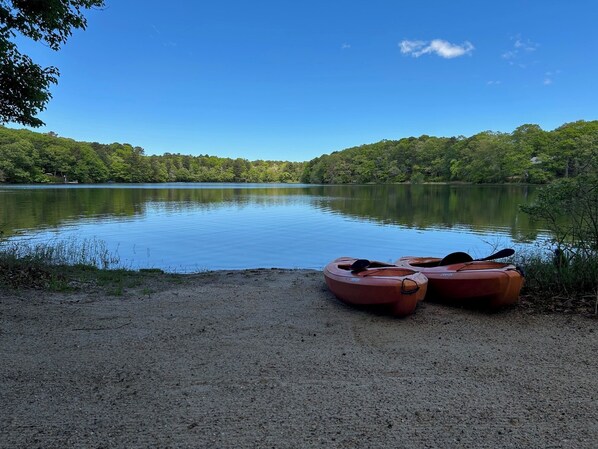 Consider this waterfront house on Fresh Pond your home away from home while exploring Falmouth. This adorable property boasts 4 bedrooms, each with its own mini-split, and 2 full bathrooms. Enjoy direct access to our freshwater pond and spend your day swimming, fishing, kayaking or simply relaxing on the sandy beach. The fully appointed kitchen with modern appliances has everything you need to prepare all your meals. Dine in the adjacent dining room or outside on the patio each with seating for 8. Patio also includes gas grill, outdoor shower and hot tub to relax in after dinner. In the morning, sit on the beach while enjoying your coffee or reading your book. Close to beaches, the ferry, multiple golf courses, breweries, Cape Cod Winery, shopping and multiple dining options. Whether you're looking for a family getaway or a romantic retreat, this charming waterfront property offers everything for a relaxing and memorable vacation.