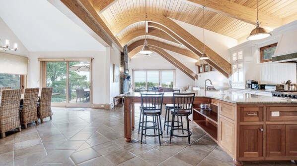 Die hochfliegende Eingangshalle hat gebogene Deckenbalken, die sich über Mahagonitreppen in ein großes offenes Wohnzimmer, ein Esszimmer und einen großzügigen Küchenbereich mit schön geschliffenen Kalksteinböden erstrecken. Die Gourmet-Küche verfügt über einen professionellen Viking-Gaskocher, einen eingebauten Sub-Zero-Kühlschrank, einen Geschirrspüler, eine Wärmeschublade, eine Mikrowelle, Marmoroberflächen und eine zentrale Insel, auf der Sie sowohl ungezwungene Mahlzeiten zubereiten als auch genießen können. Der große Essbereich mit 10 Sitzplätzen liegt gegenüber der Küche und bietet durch die großen Fenster und Glasschiebetüren einen herrlichen Blick auf das Wasser. Das Wohnzimmer am Wasser öffnet sich zu einer gro��en Mahagoni-Terrasse mit Lounge-Sitzgelegenheiten und einem Essbereich im Freien.