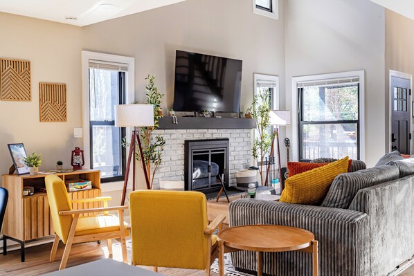 Living Room: Soaring ceilings, large windows, fireplace, cozy sofa, and Smart TV.