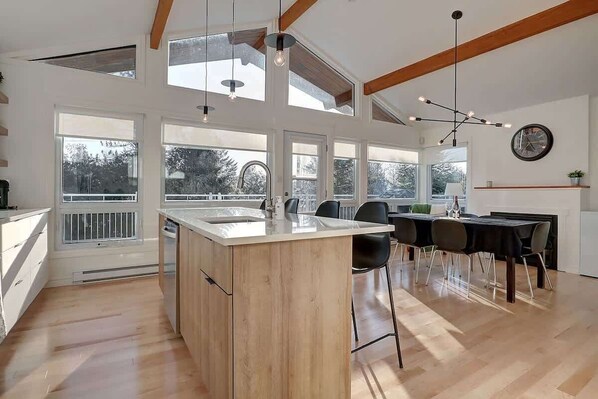 Kitchen, dining room, living room