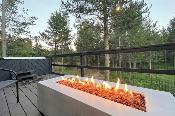 From the living room, enter the very large deck that is up above the meadow behind, overlooking the headwaters of the American River. Here, you'll find the hot tub (year round) plus fire pit (also year round, but propane does not flow in too cold of weather) plus seasonal outdoor dining with BBQ grill and outdoor living room seating in the summer.