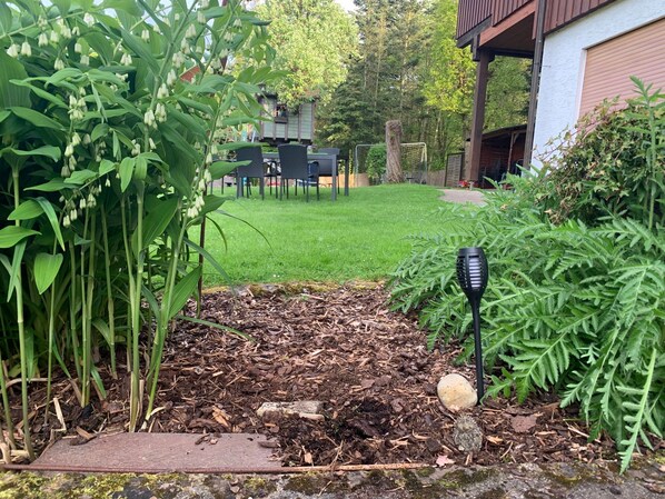 Unser Haus mit großem Garten, Grillmöglichkeiten, Sitzecken, Tischtennis und Spielplatz liegt idyllisch und ruhig am Waldrand.