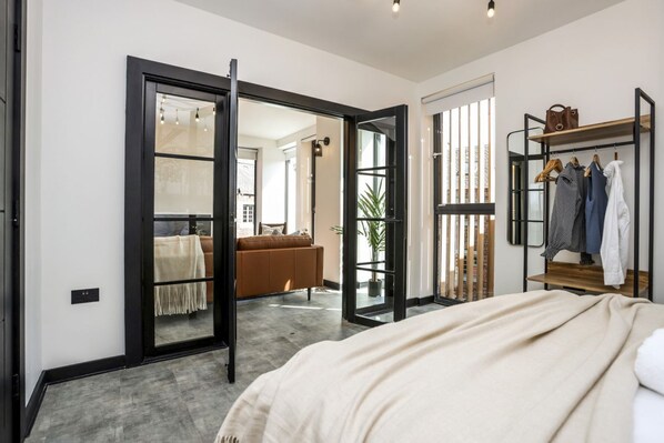 Living Room, Dining Room and Kitchen The living room boasts a comfortable sofa, a coffee table and chairs, and a flat-screen Smart TV. There is also a dedicated dining area that can seat up to four guests. The bespoke kitchenette comes fully equipped with a sink, dishwasher, induction hobs, microwave oven, fridge freezer, kettle, toaster, and a French press. All essential utensils and cookware are provided, as well as tea and artisan coffee.