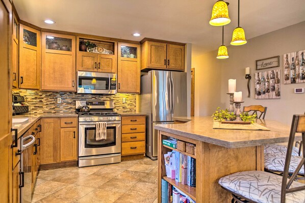 KÜCHE: Voll ausgestattet, Geschirr und Besteck, Geschirrspüler, Edelstahlgeräte, Kücheninsel