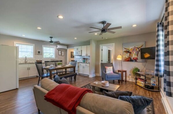The Farmhouse offers a convenient single-level layout. Prepare everything from snacks to meals in the fully stocked open concept kitchen, newly updated with granite counters, subway tile backsplash, and stainless appliances. Enjoy your creations at the eat-in kitchen. After dinner, relax in the living room on the plush furniture. It’s a perfect spot for movies or curl up with a good book.