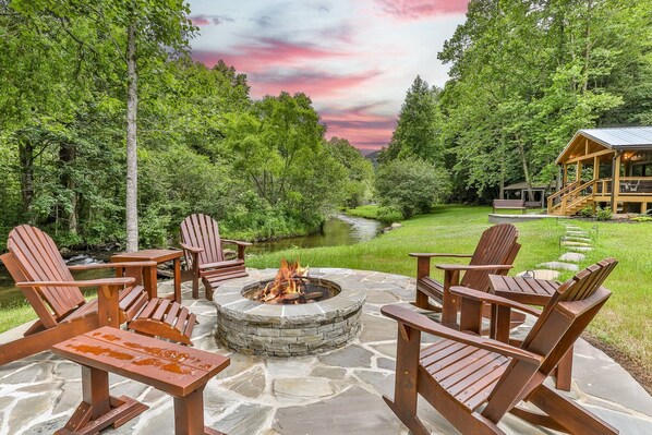 *Large, stunning rock fire pit patio on waters edge