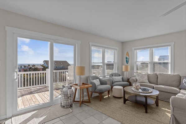 Experience breathtaking ocean views and sunsets from this beautifully decorated, semi-oceanfront coastal home, just one lot back from the beach! Enjoy DIRECT BEACH ACCESS via a landscaped walkway. This 4-bedroom, 3-bathroom home features a reverse floor plan, with an additional living room and full bath on the ground level. Sleeping arrangements include King • Queen • Queen • Queen (w/ Twin Trundle).