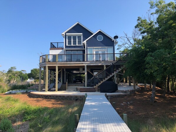 Unser wunderschönes Haus befindet sich im privaten Marsh Cove Viertel und bietet spektakuläre Ausblicke auf den Bogue Sound mit seiner Lage direkt am Wasser, bereit zum Bootfahren, Paddeln, Kajakfahren und Angeln. Das Haus liegt am Ende einer langen Auffahrt auf einer Halbinsel abseits von anderen Häusern und bietet Ihnen eine private Oase. Fühlen Sie die Meeresbrise von der weitläufigen Terrasse und genießen Sie die atemberaubende Aussicht auf Wasser, Sumpf und Tierwelt vom Dock aus. Ein kurzer Spaziergang von 5 bis 10 Minuten führt Sie zu den unberührten Stränden der Crystal Coast, der Bootsrampe mit Naturlehrpfad, Pier und Spielplatz und der Kapelle am Meer. Bringen Sie Ihre Fahrräder mit und fahren Sie auf dem Radweg, der sich entlang der grünen Insel erstreckt. Nach einem Tag am Strand am smaragdgrünen Wasser entspannen Sie sich mit einem Sitzplatz in der ersten Reihe am Dock, um spektakuläre Sonnenuntergänge zu beobachten.