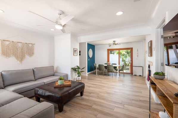 The “Moonlight” Leucadia Bungalow is the ideal place to unwind and escape to the beautiful coast. The kitchen is fully stocked with all the essentials, plus some special treats for coffee enthusiasts like a K-cup Personal Coffee Maker, a French press, a bean grinder, and a Nespresso Mini for a quick morning pick-me-up. To make your stay even more enjoyable, we’ve included a BBQ grill just off the kitchen, a private, fully fenced-in backyard with lush grass complete with patio furniture. Additionally, there is an individual enclosed laundry room with a stacked washer and dryer. Both bedrooms are equipped with comfortable Casper mattresses, and the primary bedroom features a king-size bed, a flat-screen smart TV, and a small desktop for your laptop. The guest room has two twin-sized beds, and the main living space includes a queen sofa sleeper (available on request for a small fee). All laundry, bathroom, and kitchen amenities are included. Electric car charging available onsite for an additional hourly fee.