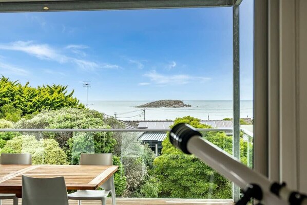 Open plan living dining, kitchen with extensive glass to take in the views of the sea. In the kitchen there is a pantry, electric cooking, dishwasher, microwave, coffee making. The lounge area has a TV and comfy seating. There is dining for ten people inside or enjoy the outdoor setting whilst cooking a BBQ on the deck and enjoying the views.