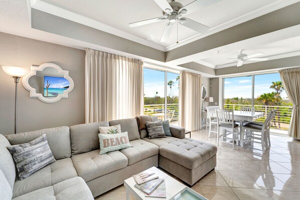 The immaculate, four-story home boasts a deck on every level, each offering phenomenal views of the marina, Gulf, and the Intracoastal. A plush sectional and smart TV set the scene for family movie nights and casual downtime in the main-floor living area. A full suite of brand-new stainless steel appliances is equipped for painless at-home meal prep. Home essentials include central air-conditioning, free WiFi, and a private washer/dryer.