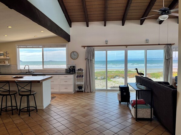 Die Küche ist komplett bestückt und mit Blick auf den Strand (es gibt keinen besseren Weg, um zu kochen!)