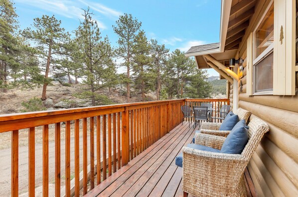 Große voll ausgestattete Küche mit Essecke Satz, ausgestattet mit einem Herd, Kühlschrank, Geschirrspüler, Mikrowelle, Kaffeemaschine, Mixer und Toaster. Große Gesteinsformationen und von oben durch eine unregelmäßig geformte viel geschaffen. Tolle Lage in der Stadt, in der Nähe von Lake Estes und nur wenige Minuten von den Rocky Mountain National Park entfernt. Erklimmen Sie die Felsen und einen hervorragenden Panoramablick bekommen!