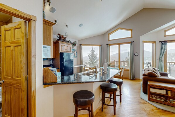 Enjoy breathtaking views from your very own private balcony, complete with a gas grill for outdoor cooking and entertaining and a private hot tub for soothing baths. Inside, you'll find a cozy wood interior and a gas fireplace perfect for snuggling up on chilly mountain nights. Curl up on your favorite sofa and stream a fun show or movie on the smart TV. If the weather is warm enough, take advantage of the shared seasonal pool for a refreshing dip. Back at your condo, discover a well-appointed kitchen with all the essentials to prepare exquisite homemade meals and treats for the crew. The main suite features a smart TV and an en suite bath. Additional perks include free WiFi and a stacked washer/dryer.