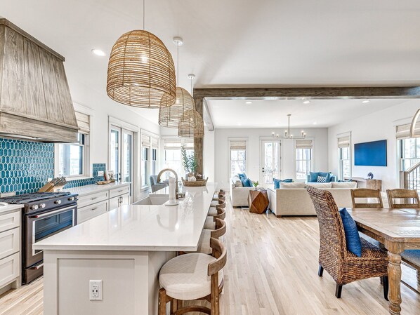 A notable feature of this home is all bedrooms have en-suite bathrooms. The primary king suite is located on the first floor. The second floor features the secondary king suite, a guestroom with a queen bed, and an oversize bunkroom boasting four queen beds.