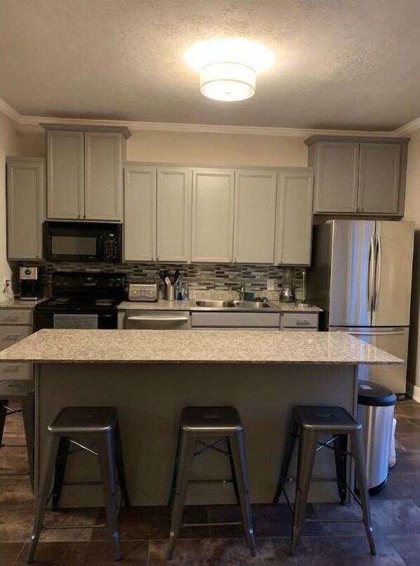 Welcome to our extremely spacious four bedroom home. FIRST FLOOR Open concept living room, kitchen, dining room with the breakfast bar. Plus, master bedroom and full bath. SECOND FLOOR: Three additional very large bedrooms and a full bath. BACKYARD Red brick patio with gas grill :) The space This is the perfect home for family get togethers. The first floor is open so everyone can visit and feel included. The Kitchen has French doors that open to the backyard patio and grill area.
