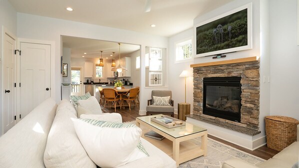 You will find comfortable, light-colored seating area with a round 60-inch table for dinning or games. The kitchen is equipped for those that like to cook at home with everything from stock pots to fun cocktail glasses.