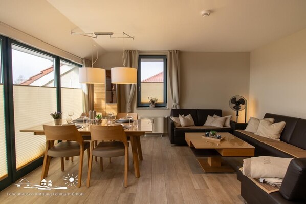 Im Wohnzimmer finden Sie ein großzügiges Ecksofa mit Schlaffunktion, einen Esstisch und einen hochwertigen Smart TV, sodass gemütlichen Fernsehabenden oder gemeinsamen Mahlzeiten nichts im Wege steht. Durch die sehr große Fensterfront können Sie auch vom Esstisch den Blick aufs Meer genießen.