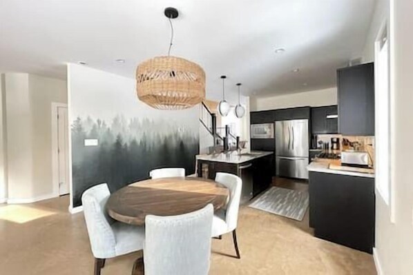The fully equipped modern kitchen is thoughtfully designed with an island that invites conversation while preparing snacks or meals. It includes all the essentials, plus oil, salt, pepper, and a taster jar of locally roasted coffee beans to get you started. Adjacent to the kitchen, the dining table comfortably seats four, perfect for enjoying meals together.
