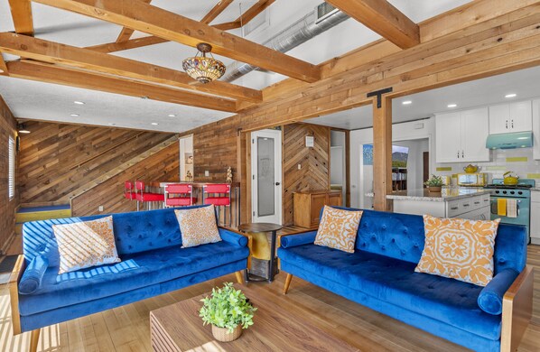 This 1945 built bungalow offers a new 2022 kitchen with shaker cabinets, granite counters, and period-style mint green and copper appliances. The living room boasts a 43" flat screen TV, fireplace, sofa futon and club chair. We have a small library of books. The bedroom offers a comfortable king size bed along with a 43" flat screen TV, and bedside lights that will also charge cell phones. The bathroom boasts a one piece toilet, corner shower, and shaker vanity.