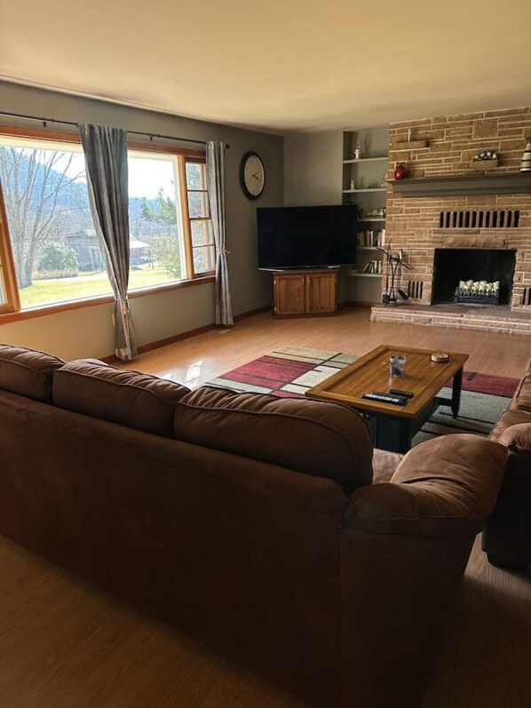 Spacious living room with 60” Smart TV with basic cable and large windows to take in the fabulous mountain view