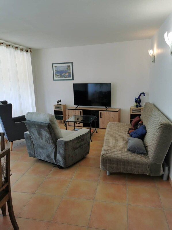 The apartment consists of two large bedrooms with a double bed and a queen-size bed, as well as a convertible sofa bed in the living room.