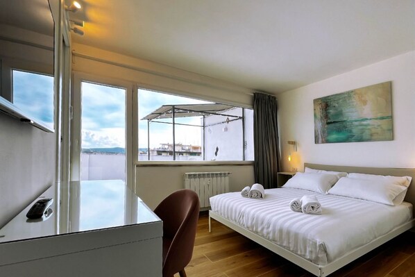 •Bedroom: one spacious queen-size bedroom with desk, Smart TV, and direct access to the private terrace.