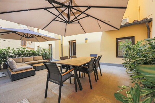 This property is part of a residential complex of luxury units in a magnificent building, located in Piazza della Signoria. The building, which has been entirely renovated, is able to meet all the hospitality needs through its individual units, as well as providing its guests with exclusive shared areas such as the refined reception area and the private interior terrace. Please note it is an apartment building, therefore there is no reception, concierge or room service