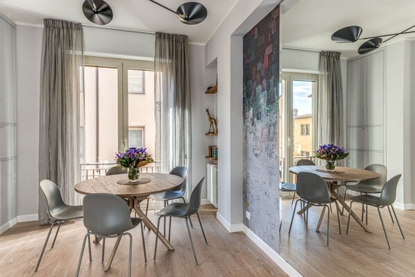 The large and very bright living room has a comfortable sofa bed, an armchair and a round table in the dining area. From the large window you can enjoy a splendid view of the Arno and Ponte Vecchio. The modern kitchen is fully equipped and stocked with everything you need to cook up your favorite meals, with a small counter where you can eat for two.