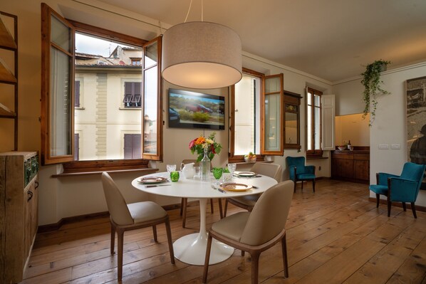 The space is completed by a beautiful living terrace, with a characteristic view of the Florentine rooftops, with all the comforts and excellent to use for moments of relaxation. A real rarity in downtown Florence homes.
