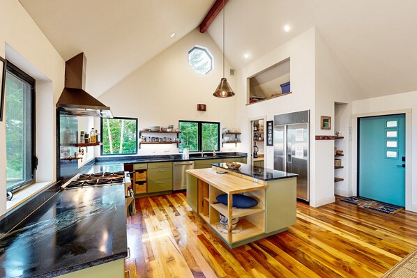 There's a wonderful openness to the house, which you'll feel whether you're relaxing in the warmth of the woodstove, gathering around the dining room table, or cooking together in the chic kitchen (complete with stainless steel appliances). Escape to the den to stream a favorite movie, curl up in the reading room with a good book, or log onto the high-speed WiFi at the desk to catch up on a bit of work. Cap each evening with stories around the firepit, leave the day's clothes in the side-by-side washer/dryer, and get a restful night's sleep in two comfortable bedrooms.