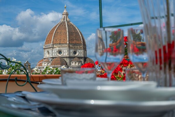 Immerse yourself in the beating heart of Florence and be captivated by the wonder of a unique panorama. Our splendid panoramic terrace offers an exclusive experience: sip a coffee at dawn while the city gently awakens, or enjoy an aperitif at sunset with the dome of the Duomo just a few steps from your eyes. With a 360° view of the city's most iconic monuments, this is the perfect place to experience Florence in all its magic, between the sound of the bells and the scent of history that envelops every street. A charming refuge that transforms every moment into an unforgettable memory.