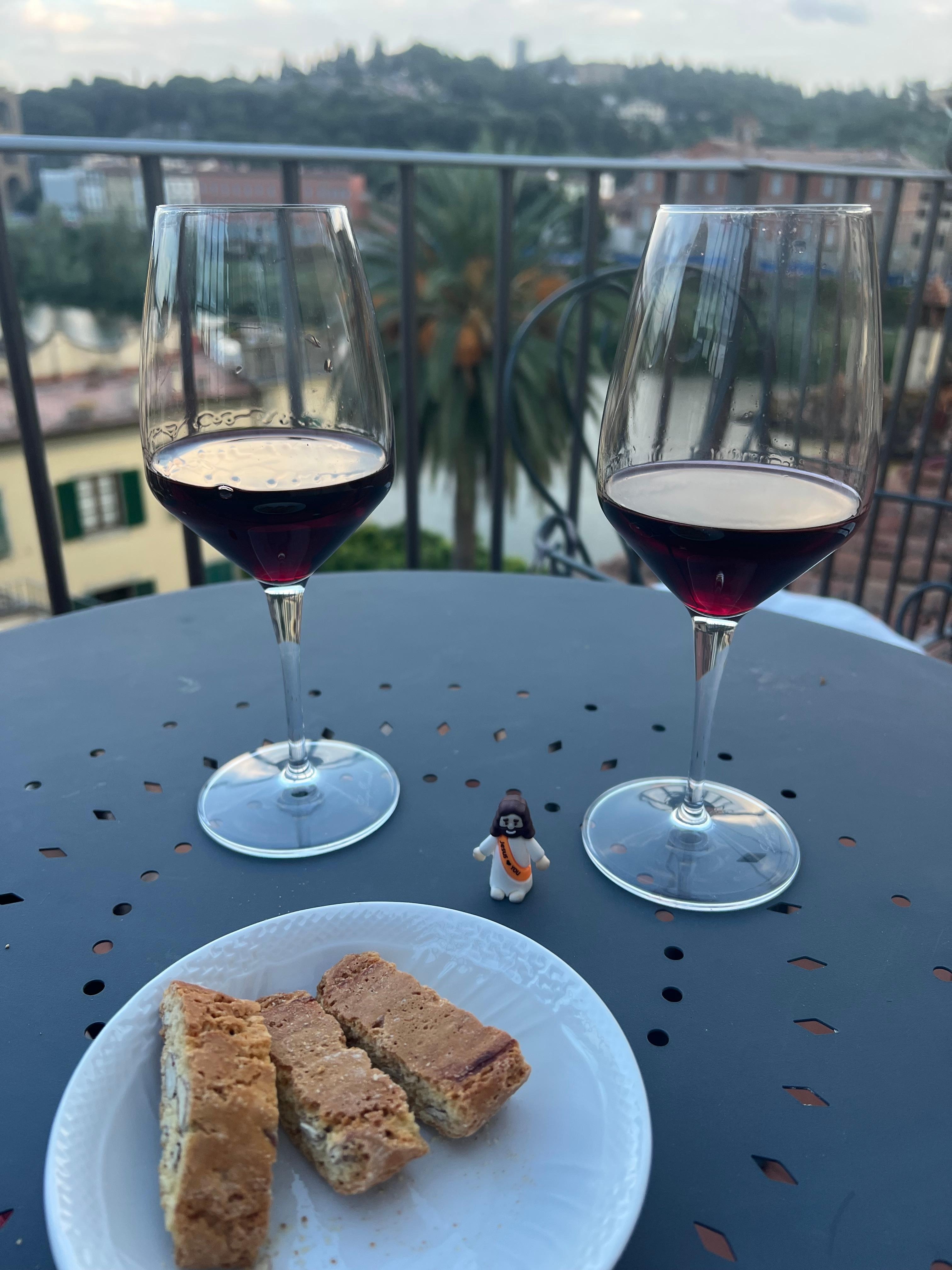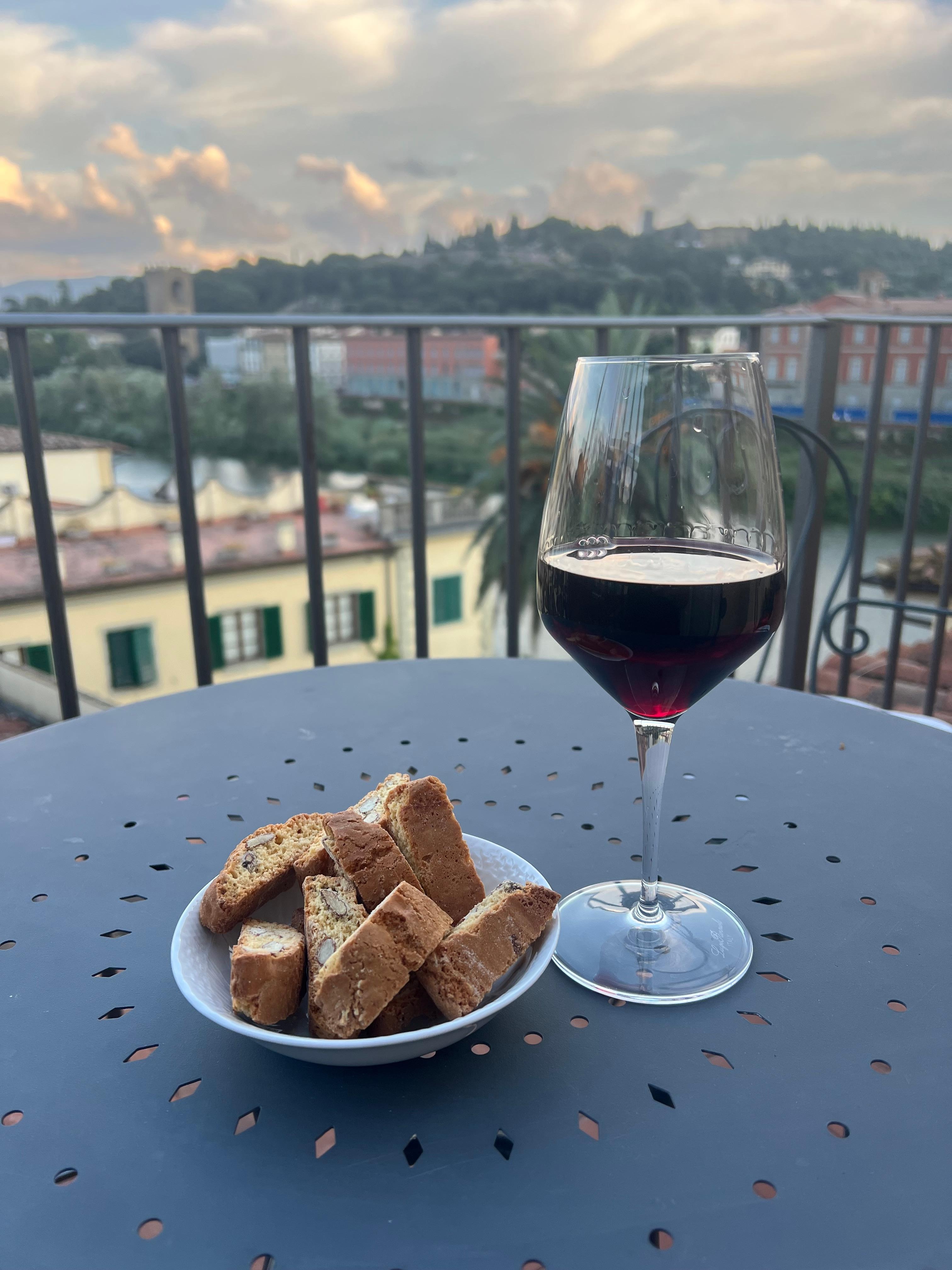 - Eine charmante, von Laternen beleuchtete Terrasse mit Pergola* für zwei Personen, die mit Jasmin (besonders schön in voller Blüte) bepflanzt ist und einen herrlichen Blick über Terrakottadachziegel auf den Fluss Arno, den Torre di San Niccolò und den Oltrarno bietet