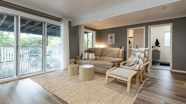The ground floor provides a second spacious living and media room with a large screen TV with Netflix, and Queen sized bed and separate bathroom providing shower and toilet. From the lower deck head into the enclosed garden with lawn.
