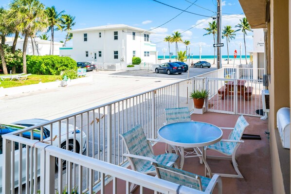 Our first time in Hollywood Beach was great. This 1 bed/1 bath is at a great location only 20-30 steps from the beach. We spent Thanksgiving with family in the area and we needed a small place for my husband and I. This apartment is in the first floor so you only need to go up 3 stairs from the street level. Parking is tight for a small SUV but the convenience of being able to park just outside the apartment was great. Instructions to check in and out were detailed and Olga, the manager was available when I texted her. We found the apartment in a very clean and tidy conditions and well maintained. Nice sheets and comfy bed with very puffy pillows. There is a patio table right outside, near the front common area and you can see the beach from there and from the front door. There are two A/C window units and that helped the hot days. Water pressure was great. I only wish there was an exhaust fan. Overall our stay was great and we could have breakfast on the beach at a restaurant only 5 mins away.