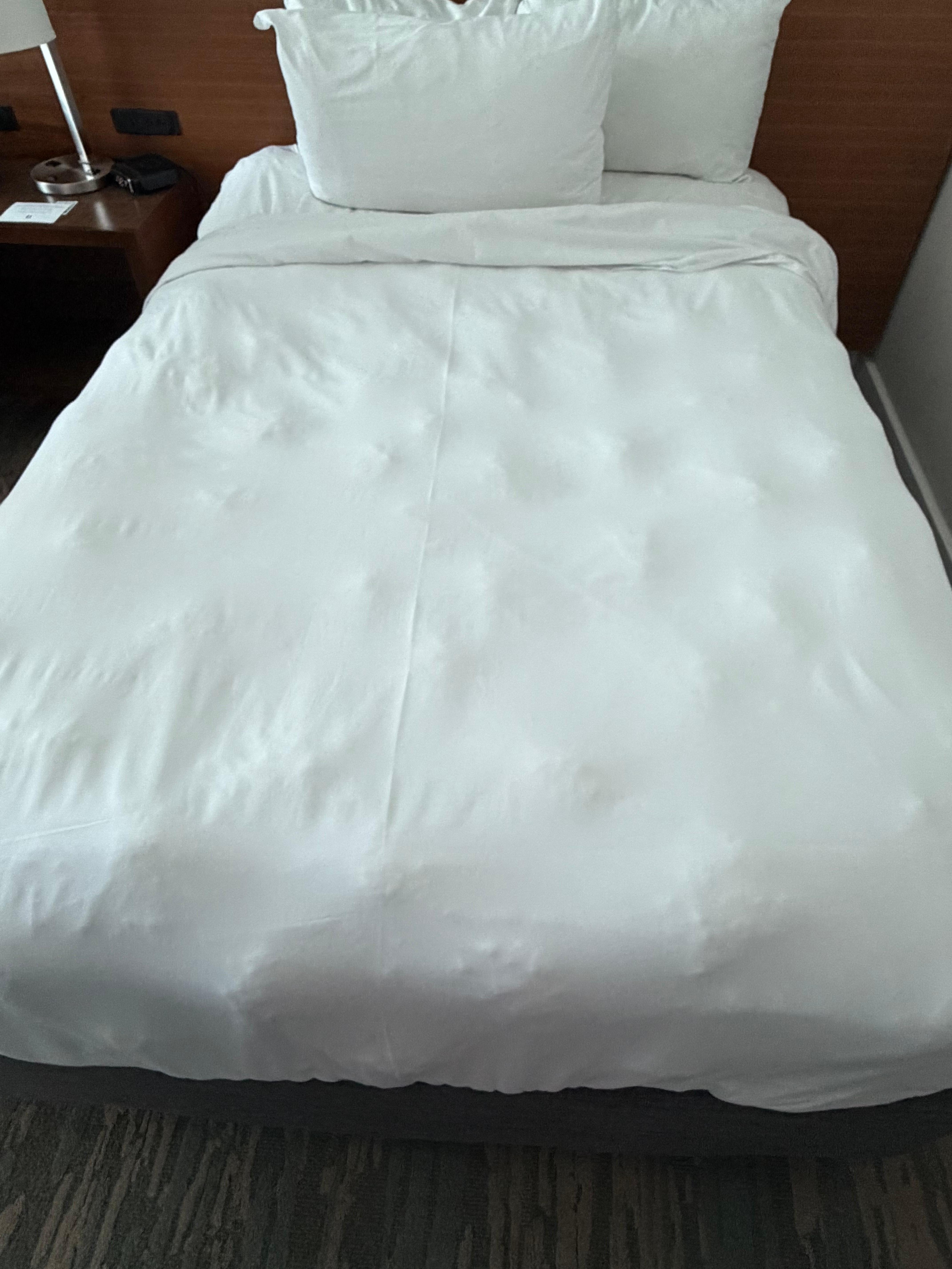 Room was dated, lamp in 1 room was not in a great state, the bedding was lumpy to the point it looked like polka dots, and there was a goldfish cracker lying on the floor which hadn’t been cleaned properly.