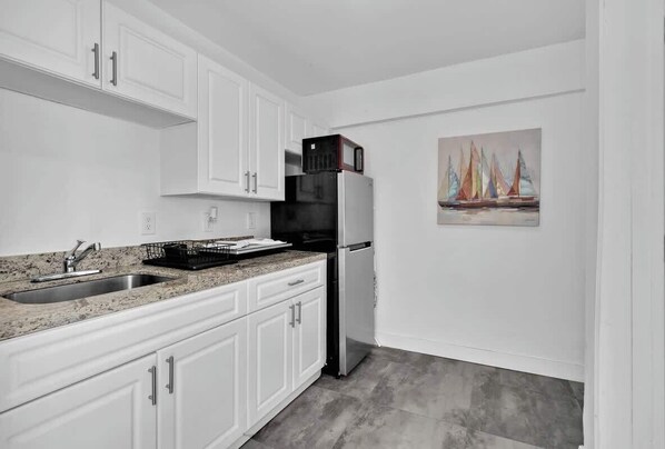 • Kitchenette equipped with a microwave, refrigerator, freezer, 2-burner stove, coffee maker, toaster, blender, kettle, and more