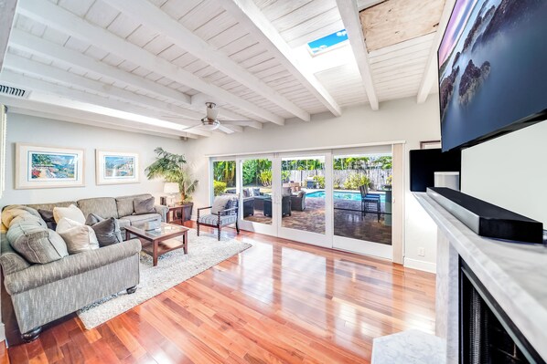 This inviting space includes a sectional sofa, smart TV, coffee table, and additional seating. Enjoy views of the pool and direct access to the backyard, making it easy to transition between indoor and outdoor living.