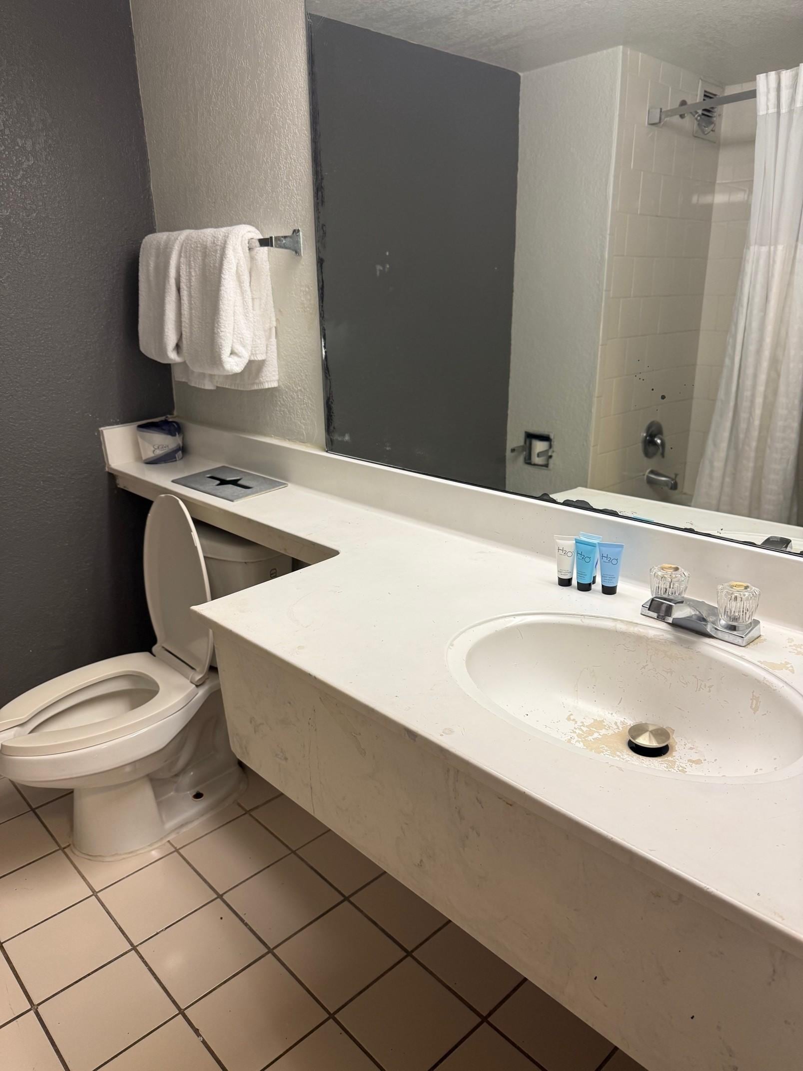 This whole hotel gives off, landlord special vibes. Broken paint all over the bathroom makes it look like everything is broken, mold in the bedroom being painted over.