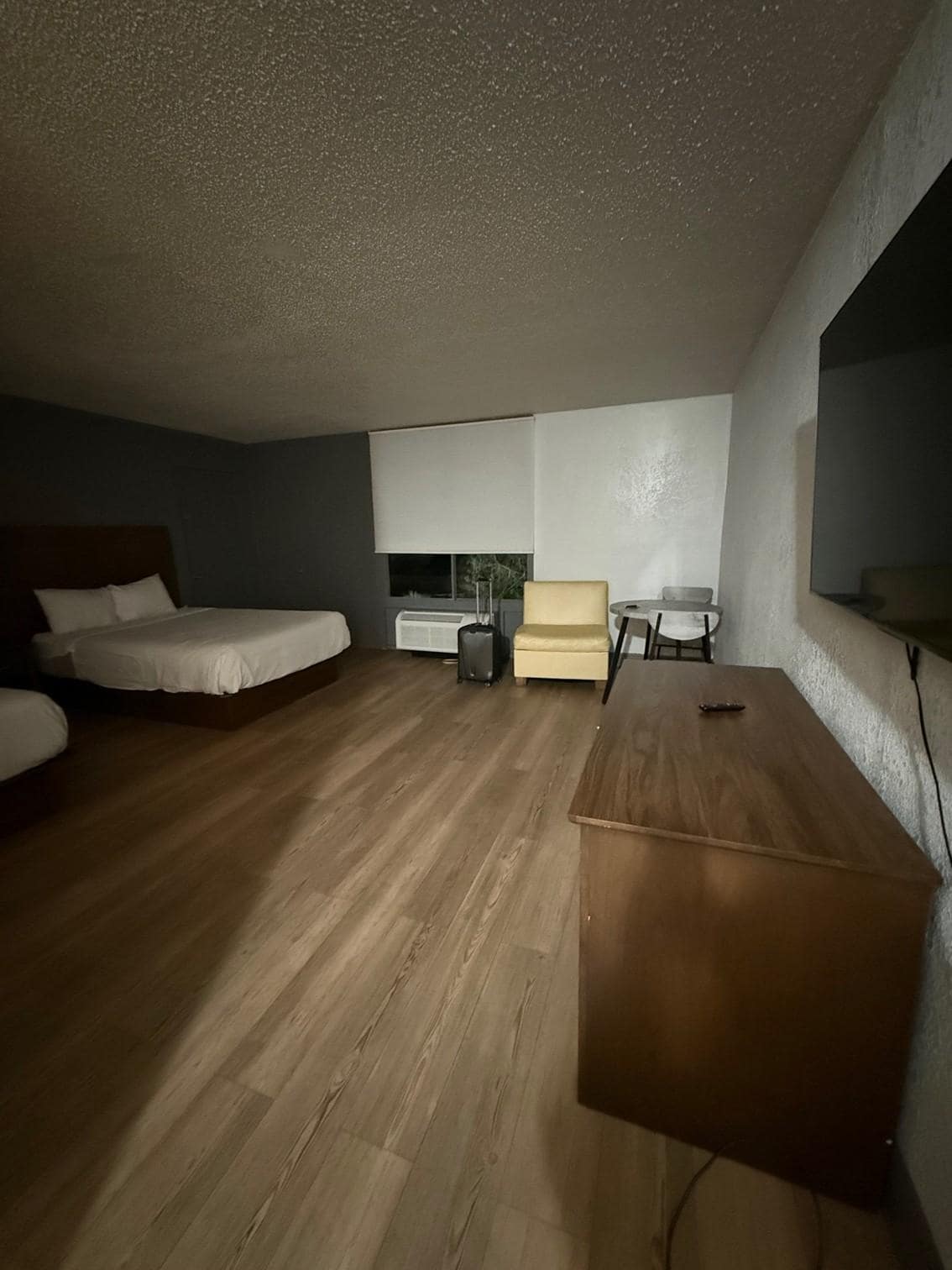 The hotel doesn’t look like the pictures as advertised! They say they are under new management and they do have a lot of remodeling going on but still… not the same! The front desk staff and security is friendly, housekeeping and maintenance take forever to respond to calls IF THEY RESPOND AT ALL. The rooms don’t have washcloths. I changed rooms 4 times, 3 of those a because of issues with my tv ( I couldn’t change the channel because of the remote or internet connection). The pool water is green and the tiki bar is taped off. The gym has 5 items in it, one of which doesn’t even have a plug to it and the sauna is out of order until further notice. The rooms are clean though and spacious. Most have a at least a microwave and some a fridge as well from what I can tell. They do sell dinners in the bar area and the gift shop is open sometimes.