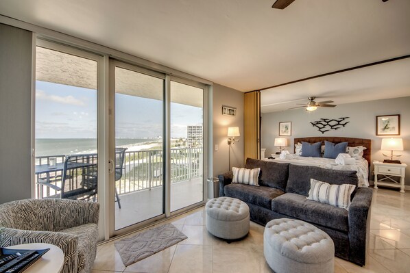 Directly on the sands, overlooking the Gulf of Mexico! This unit has all you need - featuring a private patio, full kitchen, full bathroom with walk-in shower, a king bed, and a sleeper sofa in the living area. Linens are included! We provide all bed linen, bath towels, hand towels, and even a set of beach towels you can take to the beach! Coin-operated laundry rooms are located on the ground level. Maximum occupancy of 4 guests. Truly a great space to relax and enjoy the Florida lifestyle. Sunsets here are stunning and hard to beat!