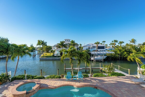 Sandy Getaway is a stunning 4-bedroom canal front home with vaulted ceilings. The living room is spacious with a large sectional and a 70in flat screen TV. Wall to wall glass doors between the living and dining area allow for natural light to engulf the spaces. A gorgeous kitchen features dark wood cabinets and stainless-steel appliances, including a wine fridge is perfect for creating a delicious meal. An oversized balcony features ceiling fans, large table to dine al fresco, and a grill. Just off the living room is the first primary bedroom that has a king bed, access to the balcony and spacious bathroom. The primary bath includes a garden tub, walk-in shower, and double sinks. On the opposite side of the balcony is the second primary bedroom with a king bed, balcony access, and attached bath with walk-in shower. The first guest bedroom features two twin beds with the other bedroom features a queen bed plus a twin over twin bunk bed. A full bathroom with tub and shower combo is shared with the two guest bedrooms. Outside is a covered patio with several seating options, ping pong table, dock, and welcoming heated pool. Come stay in a piece of paradise at Sandy Getaway.